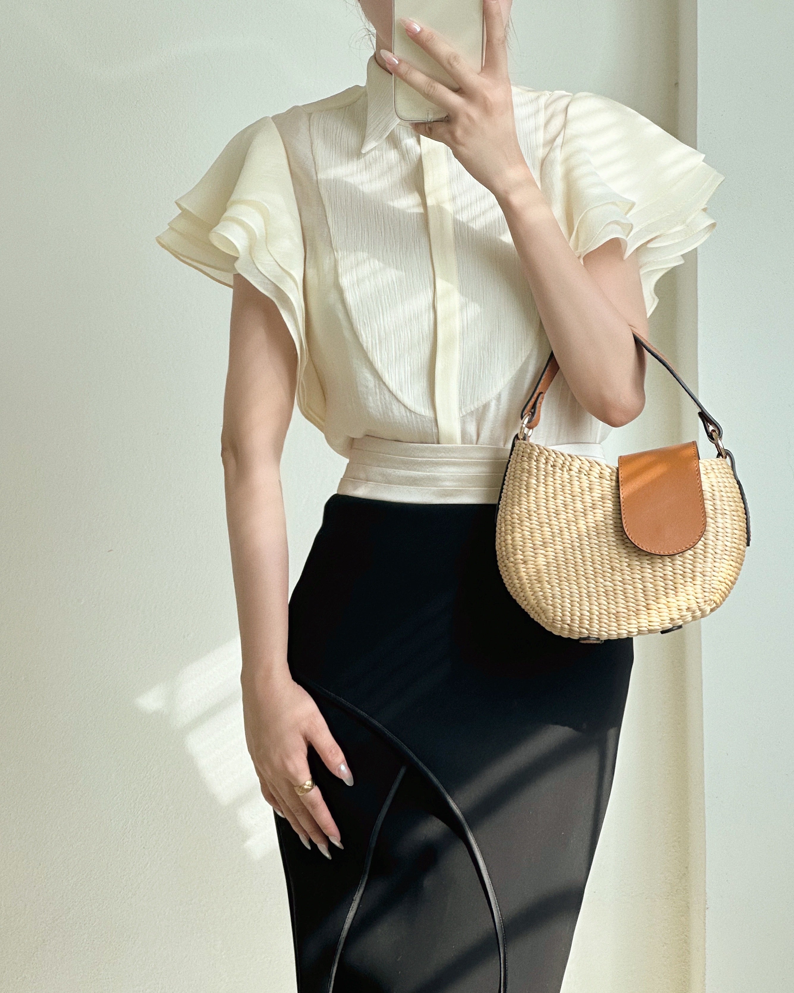 Hãy đánh thức các giác quan của bạn để khám phá một thiết kế mới mẻ nổi bật với đường viền miệng túi được cắt chéo, tạo điểm nhấn thú vị. Nắp túi bằng da mang đến sự thanh lịch và tiện dụng, đồng thời thể hiện tinh thần nổi loạn của kiểu dáng túi tròn, phồng như quả bóng.